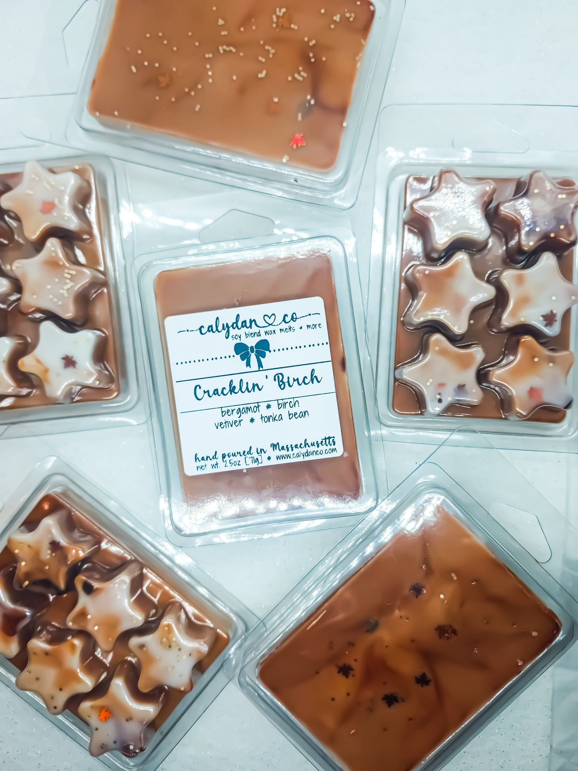 Our wax star clamshell in "Cracklin' Birch" scent. Clamshells weigh 2.5oz
